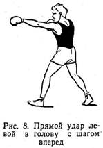 Прямой удар левой в голову с шагом вперед. Толчком носка правой ноги боксер делает шаг левой ногой вперед, наступая на носок левой ноги и перенося вес тела на полную ступню выпрямляющейся ноги. Одновременно туловище вращается слева направо, левая рука стремительно и резко выпрямляется, направляя кулак прямолинейно к цели. Правая нога после толчка и шага левой вперед подтягивается и становится в положение исходной позиции. В момент атаки боксер раскрывает правую перчатку и незначительно поднимает кисть правой руки, закрывая подбородок, а опущенным локтем страхует туловище (рис. 8).