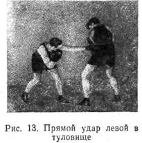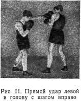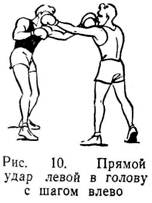 Прямой удар левой в голову с шагом влево. Толчком носка правой ноги боксер делает шаг левой ногой влево, наступая на носок и перенося вес тела на выпрямляющуюся левую ногу. Одновременно он вращает туловище слева направо, стремительно и резко выпрямляя левую руку, направляет кулак прямолинейно к цели. Правая нога после толчка и шага влево подтягивается в положение исходной позиции. Правая рука тыльной стороной перчатки страхует подбородок, а опущенным локтем — туловище (рис. 10).
