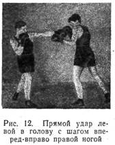 Прямой удар левой в голову с шагом вперед правой ногой. Толчком носка правой ноги боксер подает тело вперед, одновременно поворачивая туловище справа налево, слегка сгибая левую ногу в коленном суставе.