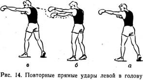 Повторные прямые удары левой в голову, в туловище успешно применяются в бою. Быстрота и стремительность нанесения первого удара прямой левой в голову обеспечивают успех нанесения второго удара левой в туловище. Противник не успевает осознать происшедшее. Защищая голову руками, он открывает свое туловище, что позволяет беспрепятственно нанести последующий удар.