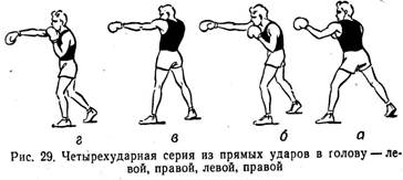 Четырехударные серии из прямых ударов наносятся: в голову; в голову и туловище; в туловище и голову.