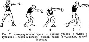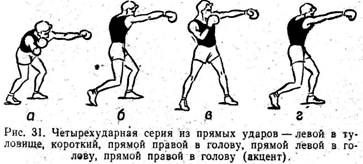 Другая четырехударная серия прямых ударов в туловище и голову с дальней дистанции состоит из удара левой в туловище — короткого прямого удара правой в голову,— прямого левого в голову (оставляя руку после удара вытянутой в сторону головы) — акцентированного прямого правой в голову (рис. 31).