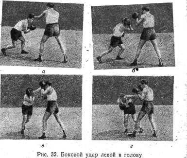 При боковом ударе левой в голову из позиции дальнего боя боксер, толчком правой ноги, шагая незначительно левой ногой вперед и вращая туловище справа налево, переносит тяжесть тела полностью на левую ногу. Из этого исходного положения толчком левой ноги он делает резкий бросок тела, вперед, одновременно выпрямляясь и вращая его слева направо. Шагая при этом правой ногой вперёд, он направляет боковой удар левой в голову. Во время удара кулак, повернутый пальцами к себе, сжимается, правая рука ладонью страхует голову, а опущенным локтем — туловище. В момент нанесения удара левой в голову локоть руки находится на уровне плеча (рис. 32).