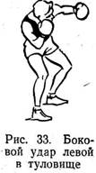 Боковой удар левой в туловище. Техника выполнения бокового удара левой рукой в туловище мало чем отличается от техники выполнения этого удара в голову. Из исходного положения тела, подготовленного как и для нанесения удара левой в голову толчком левой ноги, боксер посылает тело вперед и, поворачивая его слева направо, направляет боковой удар левой в туловище (рис. 33). Туловище при толчке левой ногой вперед и повороте его слева направо в пояснице не разгибается, рука выпрямляется больше, кулак сильно согнут в лучезапястном суставе, а шаг правой ногой вперед и несколько вправо делается длиннее, чем в первом случае.