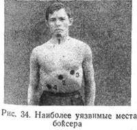 Точные удары, резко нанесенные в наиболее уязвимые места на теле боксера, могут вызвать кратковременную потерю боеспособности или прекращение судьей на ринге дальнейшего хода боя. К наиболее уязвимым местам относятся нижняя челюсть — 1, область солнечного сплетения — 2, область сердца — 3, область печени — 4 (рис. 34). Эти области тела должны тщательно защищаться в бою и в повседневной тренировочной практике.