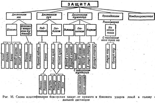В технике современного бокса существует пять видов защиты (рис. 35): движениями ног, движениям рук, движением туловища, приседанием, комбинированная.