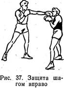 Защита шагом вправо. Защиту шагом вправо применяют от прямого удара левой в голову с тем, чтобы вызвать промах противника л использовать его для ответной контратаки прямыми ударами в голову. В момент атаки противника толчком левой ноги боксер делает шаг вправо, одновременно страхуя тыльной стороной ладони правой руки подбородок и подтягивая левую ногу в исходное положение (рис. 37).