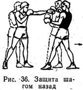 Защита шагом назад. Для того, чтобы избежать удара и сохранить дальнюю дистанцию, применяют уход шагом назад. В момент атаки противника прямым или боковым ударом в голову или туловище боксер делает быстрый шаг назад, сохраняя при этом страховку головы и туловища правой рукой (рис. 36).