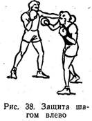 Защита шагом влево. Защиту шагом влево применяют от прямого удара левой в голову с тем, чтобы вызвать промах противника и ответить прямым ударом левой в голову. Толчком носка правой ноги боксер делает шаг влево, одновременно страхует голову ладонью левой руки, вытягивая правую и поворачивая тело справа налево для ответного прямого удара левой в голову и развития контратаки на средней дистанции прямыми ударами (рис. 38).