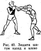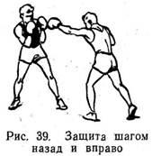 Защита шагом назад и вправо. Защиту шагом назад и вправо применяют от прямого или бокового удара левой в голову и для того, чтобы вызвать промах противника и сохранить удобную дистанцию для контратаки прямыми ударами левой, правой в голову. Толчком носка левой йоги боксер делает шаг назад вправо, одновременно он страхует голову ладонью правой руки и подтягивает левую ногу в исходное положение (рис. 39).