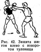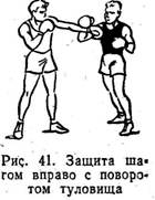 Защита шагом вправо с поворотом туловища (уходом). Уход шагом вправо с поворотом туловища применяют от прямого удара левой в голову. В момент атаки противника прямым ударом левой в голову боксер толчком носка левой ноги делает шаг вправо, одновременно поворачивает тело слева направо, а ладонью правой руки отбивает от себя руку противника. Созданное исходное положение немедленно используется для ответных ударов левой в туловище снизу или боковым в голову, а затем акцентированным коротким прямым ударом правой в голову (рис. 41).