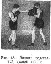 Защита подставкой правой ладони. Подставку правой ладони применяют от прямого удара левой в голову с тем, чтобы нанести ответный прямой удар левой в голову и развить контратаку серией прямых, ударов на средней дистанции. Толчком носка левой ноги боксер отклоняет тело назад, перенося его вес на правую ногу и подставляя под удар противника ладонь правой руки. Как только удар плотно коснется ладони, боксер немедленно отталкивается от пола носком правой ноги и выполняет ответный прямой удар левой в голову (рис. 43).