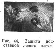 Защита подставкой левого плеча. Подставку левого плеча применяют от прямого удара правой или левой в голову с тем, чтобы нанести ответный удар прямым правой в голову и развить контратаку серией ударов на средней и ближней дистанциях. Подставка левого плеча применяется при атакующем прямом ударе правой или левой в голову в конце движения. Одновременно боксер страхует подбородок ладонью правой руки, поворачивает туловище слева направо и переносит вес тела на правую ногу (рис. 44).