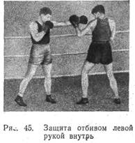 Защита отбивом левой рукой внутрь. Защита отбивом левой рукой внутрь производится ладонью в последний момент движения кулака противника к цели. С движением левой руки делающий отбив боксер делает одновременно небольшой шаг левой ногой вперед и вместе с отбивом руки противника поворачивает туловище слева направо и незамедлительно наносит прямой удар правой в голову, подтягивая правую ногу в исходное положение (рис. 45).