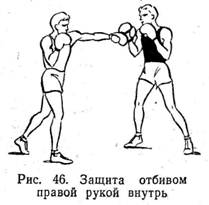 Защита отбивами. Отбивы применяют преимущественно от прямого удара левой в голову. Отбив производится в предплечье ладонью правой или левой руки внутрь или вниз или тыльной стороной перчаток наружу или кверху.