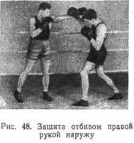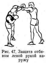 В момент атаки противника прямым ударом левой руки в голову боксер толчком носка левой ноги делает выпад правой ногой вправо, одновременно наклоняя туда же туловище, и отбивает тыльной частью ладони руку противника наружу (рис. 47).