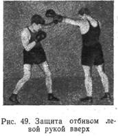 Защита отбивом левой рукой вверх. В последний момент движения кулака противника к цели боксер слегка приседает и тыльной частью ладони левой руки, согнутой в локтевом суставе под прямым углом, отбивает предплечье вверх (рис. 49). Из этого исходного положения удобно нанести прямой удар снизу правой рукой в голову. Во время нанесения прямого удара правой снизу в голову левая рука ладонью страхует голову, а опущенным локтем — туловище.