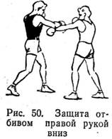 В последний момент движения кулака противника к цели боксер отбивает ладонью правой руки предплечье вниз и быстро наносит ответный прямой удар левой в голову (рис. 50). При защите отбивом левой рукой вниз боксер быстро наносит ответные прямые удары право в голову, прямой снизу левой в голову.