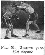 Защита уклоном вправо. В момент атаки противника прямым левой в голову боксер делает, навстречу удару небольшой шаг, одновременно уклоняясь вперед-вправо приблизительно под углом 45° по отношению к противнику. Руки боксера при защите уклоном вправо прижаты к туловищу, голова опущена и слегка прикасается к левому-плечу; правая нога подтягивается, и ноги оказываются расставленными на ширину плеч (рис. 51).