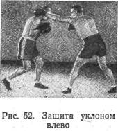 Защита уклоном влево. В момент атаки противника прямым или боковым ударом левой рукой в голову боксер толчком правой ноги делает незначительный шаг левой ногой вперед, одновременно поворачивая туловище справа налево, приблизительно на 45 по отношению к противнику. Из этого исходного положения ему очень удобно нанести ответный удар снизу в туловище, прямой снизу в голову или боковой левой в голову на средней или ближней дистанции и развить контратаку серией ударов (рис. 52).
