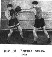 При атаке противника прямым или боковым ударом левой в голову в последний момент боксер отклоняет туловище назад, назад и вправо или назад и влево, одновременно создавая исходное положение для соответствующих ответных ударов (рис. 53).
