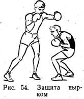 Защита нырком от прямого удара левой в голову в искусных боксеров выполняется очень слитно, красиво и эффективно, с небольшой амплитудой движения туловища (рис. 54).