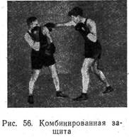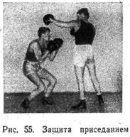 Защита производится в конце удара при помощи равномерного приседания на обе ноги. Если боксер после защиты готовится ответить ударом левой рукой в голову или туловище, то; приседая, он переносит вес тела больше на левую ногу и вперед, а при нанесении удара правой рукой, наоборот, вес тела передает на правую ногу (рис. 55).