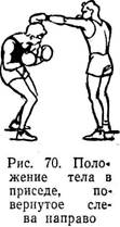 Положение тела в приседе, повернутое слева направо. Данное исходное положение тела удобно использовать для атаки и контратаки прямым ударом снизу правой в голову с шагом вперед или вперед и влево без перенесения веса тела с правой ноги или же с перенесением веса тела на противоположную удару левую ногу (рис. 70).