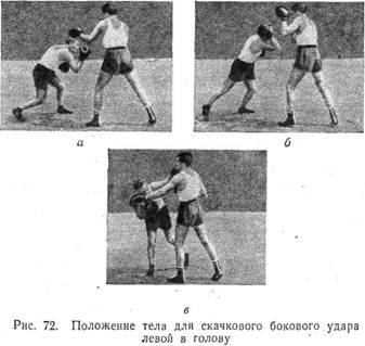 Подготавливая исходное положение для нанесения бокового (скачкового) удара левой в голову, боксеры успешно применяют прямой или боковой удар правой в туловище. Дойдя до цели, они вызывают у противника небольшой наклон туловища вниз и опускание рук, в связи с чем открывается голова, куда и наносится акцентированный скачковый удар левой рукой.