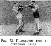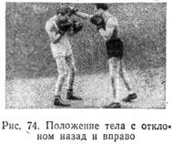 Положение тела с отклоном назад и вправо. Исходным положением тела с отклоном назад боксер пользуется в бою, маневрируя из этого исходного положения отклонами вправо или влево для защиты от прямых и боковых ударов в голову (рис. 74).