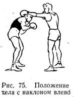 Положение тела с наклоном влево боксер создает, защищая от прямого удара левой в голову. Из положения, когда тело наклонено влево и вес тела больше перенесен на левую ногу, быстрее и удобнее нанести прямой удар левой в голову с оставлением веса тела на левой ноге. Удар выполняется за счет толчка носком левой ноги и поворота туловища слева направо. Положение кулака при посыле его в цель естественное — пальцами вправо. Тыльной стороной перчатки боксер страхует подбородок, а опущенным локтем — туловище (рис. 75).