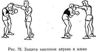 Защитой отклоном назад и влево пользуются от прямых ударов левой в голову, после атаки прямым ударом правой в голову. Отклоны назад и влево дают возможность избежать обоих ударов, а затем самому перейти в ответную контратаку прямым левой в голову, правой, снизу в туловище (рис. 78).