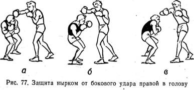 Цель защиты — заставить противника промахнуться, а также перехватить у него инициативу, нанеся ответные боковые удары в голову. При проведении серии боковых ударов в голову боксер обычно сближается с противником на дистанцию ближнего боя, где удары наносятся только согнутыми в локтях руками. Наносить боковые удары на средней дистанции удаётся очень редко, обычно в тех случаях, когда противник отходит назад. Преследование его боковыми ударами с продвижением вперед позволяет сохранить прежнюю дистанцию. Нырок от бокового удара правой в голову выполняется боксером в одном слитном круговом движении туловища вправо, вниз, влево и вверх с включением в него небольшого приседания (рис.77).