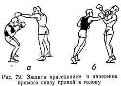 Техника нанесения ответных ударов после приседания имеет разнообразные формы. Можно нанести прямые снизу и боковые удары с перенесением веса тела на противоположную удару ногу, а можно те же удары, например боковой правой в голову, нанести, когда вес тела переносится на одноименную удару правую ногу (рис. 79).