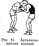 Активнозащитная позиция. Туловище согнуто в пояснице и наклонено вперед. Таз несколько подан назад. Ноги слегка согнуты и расставлены на ширину плеч. Ступни ног параллельны. Вес тела распределен равномерно на обеих ногах. Находясь в позициях, боксеры слегка касаются друг друга головами (у левого плеча). Руки согнуты в локтевых суставах под острым углом и плечевой частью прижаты к туловищу. Мышцы тела не напряжены. Ноги в коленных суставах слегка согнуты и опираются о пол всей ступней (рис. 81).