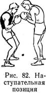 Наступательная позиция. Туловище слегка согнуто в пояснице. Таз несколько подан вперед. Ноги согнуты в коленях, расставлены на ширину плеч и касаются пола всей ступней. Ступни ног параллельны. Вес тела равномерно распределен на обеих ногах. Руки, согнутые в локтевых суставах под острым углом, опущены вниз и слегка касаются туловища. Боксеры в позиции не касаются головами друг друга (рис. 82).