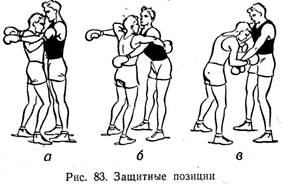 Защитные позиции. 1. Туловище выпрямлено, несколько наклонено вперед и слегка прижато к туловищу противника. Ступни ног параллельны и поставлены на ширину плеч. Вес тела распределен равномерно на обеих ногах. Накладывая предплечья на предплечья противника или сгибы его локтевых суставов, боксер не дает противнику возможности наносить боковые удары в голову (рис. 83, а).