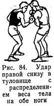 Рассмотрим технику удара правой и левой рукой снизу в туловище и голову в ее трех основных вариантах: с равномерным распределением веса тела на обеих ногах, с переносом веса тела на разноименную ногу, то же — на одноименную ногу.