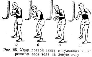 Удар правой снизу в туловище с переносом веса тела на левую ногу. Из наступательной или активнозащитной позиции боксер толчком левой ноги переносит вес тела на правую ногу, вращая таз слева направо и подавая его несколько назад.