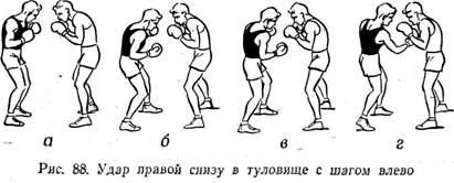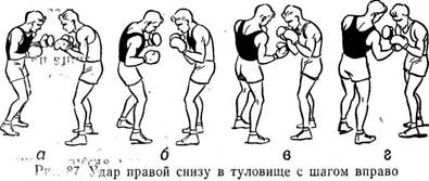 Удар правой снизу в туловище с шагом вправо. Из наступательной или активнозащитной позиции боксер делает шаг правой ногой вправо, перенося на нее вес тела, сгибая ногу в колене и опуская правое плечо. При этом он поворачивает таз слева направо и несколько назад.