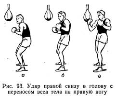 Из этого исходного положения боксер начинает движение, резко выпрямляя ноги и спину и направляя кулак снизу вверх пальцами к себе, делая при этом резкий рывок плечом кверху и в момент удара приподнимаясь на носки (рис. 92).