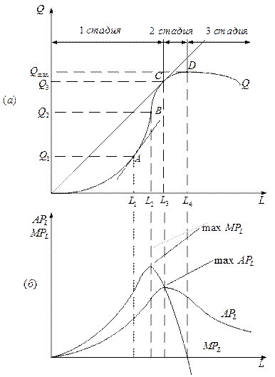 Рис. 5.1. Общий (а), средний и предельный продукты (б)