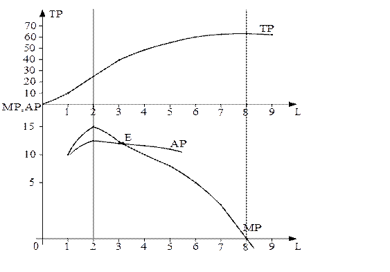 Результаты произведенных расчетов и их графическое изображение (рис. 5.2) свидетельствуют о возрастающей отдаче вовлекаемых в производство двух единиц труда (L = 2) и последующей убывающей отдаче каждой дополнительной единицы труда (L ³ 3).