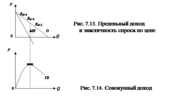 Предельный доход непосредственно зависит от эластичности спроса. Когда спрос эластичен, увеличение выпуска повышает совокупный доход и предельный доход положителен. При неэластичном спросе увеличение объемов выпуска сокращает совокупную выручку, и предельный доход отрицательный. В случае единичной эластичности по цене, увеличение величины спроса полностью компенсируется снижением цены. Совокупная выручка при этом не меняет своей величины, а предельный доход равен нулю. Эта зависимость представлена на рис. 7.13 и рис. 7.14.