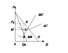 Если при равновесном объеме производства (QE) цена монополии (PE) оказывается выше средних издержек (АС), то положительная разница между ними составит среднюю прибыль фирмы (на рис. 7.15 отрезок KL). Умножив эту прибыль на объем выпуска (QE), получим общий объем монопольной прибыли (на рис. 7.15 площадь прямоугольника KLMPE).