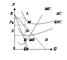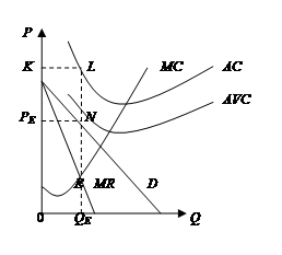 При равновесном объеме производства (QE) равновесная цена ниже средних издержек (PE<AC), но превышает средние переменные издержки (PE >AVC), фирма получает операционную прибыль и тем самым минимизирует свои убытки. Кривая AC проходит выше кривой спроса, а кривая AVC – частично выше кривой спроса. Вертикальный отрезок MN отражает операционную прибыль, а прямоугольник PEMNS – общую прибыль от производства. Верхний прямоугольник KLMPE соответствует величине экономических убытков и равен части постоянных издержек, которые не могут быть покрыты столь низкой ценой PE .