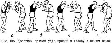 Из этого исходного положения боксер толчком правой ноги делает шаг влево, одновременно вращает туловище справа налево и переносит вес тела на левую ногу. Вместе с вращением туловища и переносом веса тела на левую ногу боксер поворачивает руку в плечевом суставе и направляет кулак прямолинейно к цели. В последний момент кисть в лучезапястном суставе сгибается вперед (рис. 106).