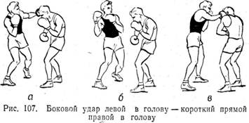 Повторный удар снизу в туловище боксер усиливает поворотом таза и туловища и движением их вперед. Удар снизу в голову боксер усиливает резким выпрямлением спины, делая рывок плечом вверх, выпрямляя ноги и поднимаясь на носки. На рис. 111 показан повторный удар правой снизу в туловище — голову.