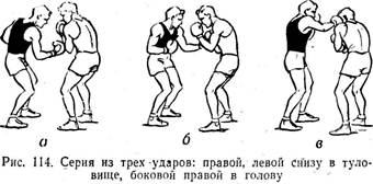 В каждой отдельной трехударной серии третий удар, завершающий серию, наносят с акцентом. Следовательно, первые два удара должны отвлекать противника от защиты того места на его теле, куда будет нанесен третий — акцентированный — удар (рис. 112, 113, 114).