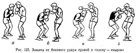 Защищаясь от бокового удара правой, боксер из наступательной позиции одновременно, в одном слитном движении, немного поворачивает туловище слева направо, слегка приседая, уклоняется вправо, делает наклон вниз, поворачивает туловище справа налево и одновременно выпрямляется. Руки согнуты в локтях под острым углом и слегка прижаты к туловищу (рис. 125).